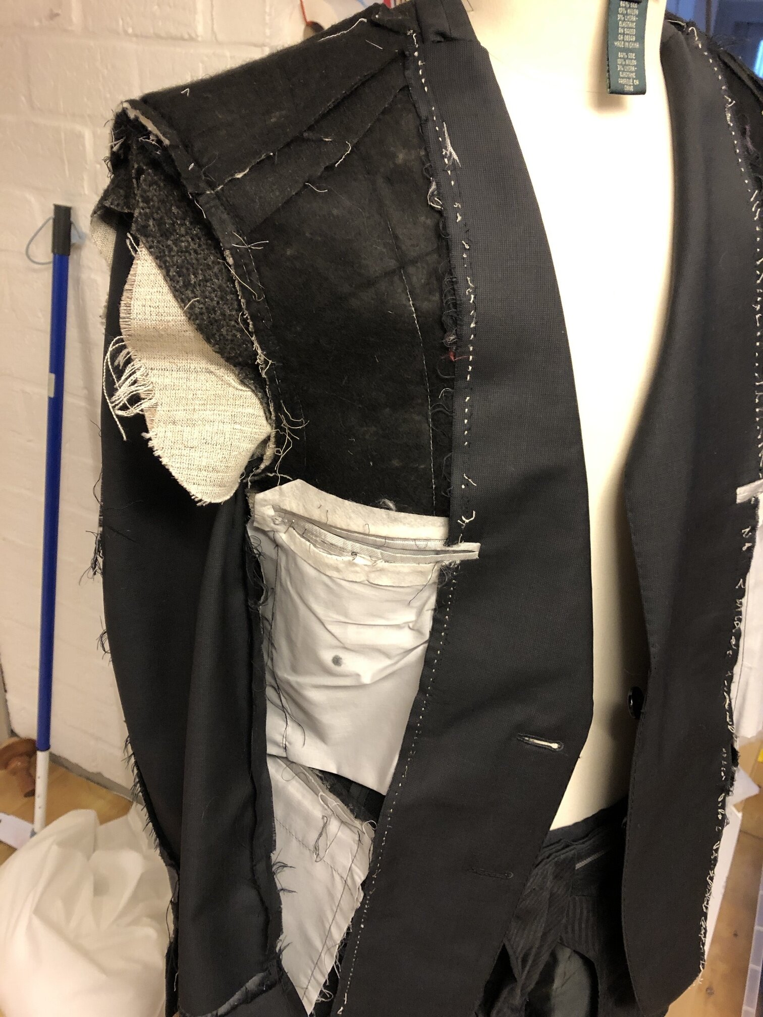 Door het pak op te vullen, als ware het een kussen, heb ik een karikatuur gemaakt van wat het pak voor mij symboliseert. Hiermee wordt het pak volledig uit zijn context gehaald.